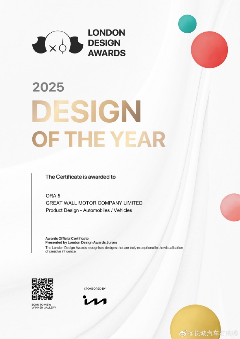ความสำเร็จบนเวทีการออกแบบระดับนานาชาติครั้งนี้ ที่ทำให้ก้าวขึ้นเป็นรถยนต์รุ่นแรกของโลกที่ได้รับการผลิตจริงและสามารถคว้ารางวัลสูงสุดดังกล่าว ตอกย้ำให้เห็นถึงความโดดเด่นของรถในฐานะรถยนต์ที่ได้รับการพัฒนาภายใต้แนวคิดการออกแบบที่ผสานความงามจากธรรมชาติเข้ากับนวัตกรรมสมัยใหม่อย่างลงตัว ไม่เพียงสร้างเอกลักษณ์ที่แตกต่าง แต่ยังยกระดับมาตรฐานการออกแบบยนตรกรรมให้ตอบโจทย์ทั้งด้านสุนทรียศาสตร์และการใช้งานในชีวิตประจำวัน สะท้อนถึงวิสัยทัศน์และศักยภาพของ GWM ในการสร้างสรรค์ยนตรกรรมที่ได้รับการยอมรับในระดับโลก พร้อมเปิดโอกาสให้ผู้สนใจชาวไทยได้ร่วมสัมผัสดีไซน์อันโดดเด่นของ GWM ORA 5 อย่างใกล้ชิด และเตรียมพบกับการเปิดตัวอย่างเป็นทางการในประเทศไทยได้ภายในเดือนมีนาคมนี้