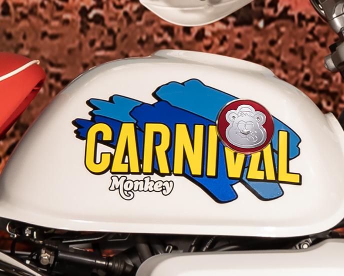 Monkey Carnival Limited Edition ได้รับการออกแบบด้วยแรงบันดาลใจจาก Baja Motocross ที่โด่งดังในอดีต ถ่ายทอดกลิ่นอายของรถสายลุยสู่ Monkey ได้อย่างลงตัว โดดเด่นด้วยลายกราฟิกแนวสตรีทบนถังน้ำมัน Carnival Fuel Tank มาพร้อมเบาะ Carnival Red Seat สีแดง เติมสีสันให้สตรีทไปอีกขั้น เสริมลุคความเป็น Motocross ด้วย Carnival Hand Guard และ Carnival Wind Shield ให้สายลุยได้สนุกอย่างเต็มที่ ตอกย้ำความ Limited ด้วยการรัน Serial Number เลข 01-99 ที่ตัวถังและครอบกรองอากาศด้านข้างรถ