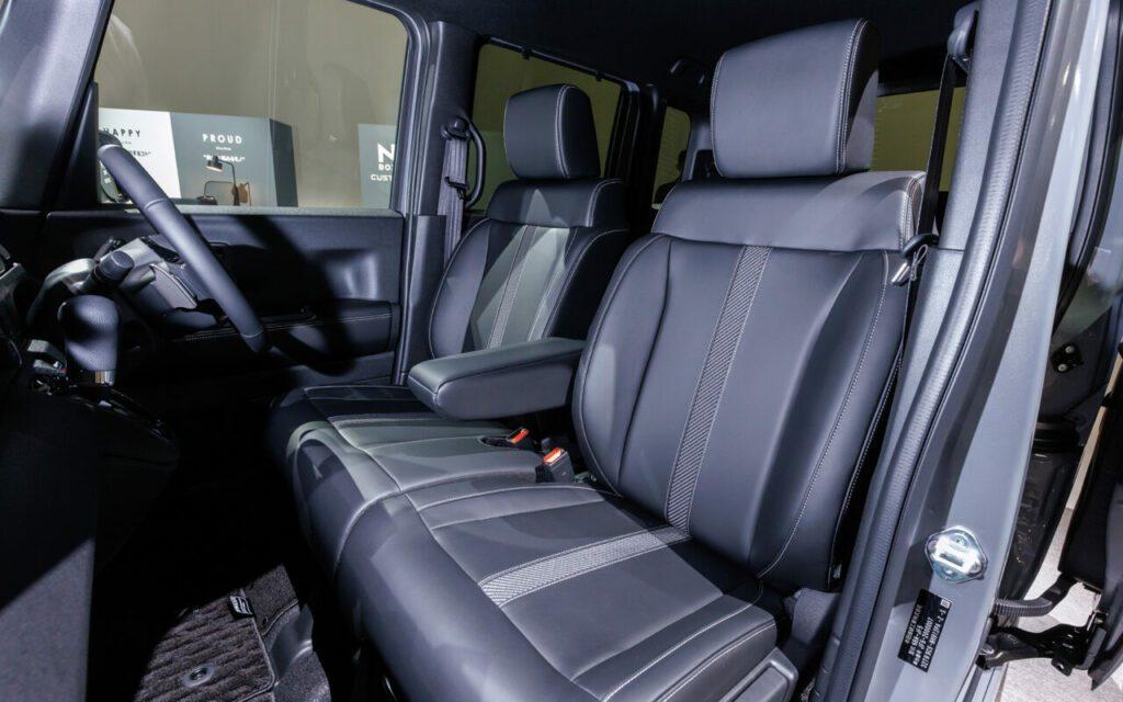 Honda N-BOX Custom ตกแต่งเข้มเน้นความสปอร์ตทั้งคันตั้งแต่ ชุดไฟหน้า LED แบบ 2 ดวง ข้างบนจะมีแถบไฟ DRL แบบ LED พร้อมไฟเลี้ยววิ่ง Sequential Turn Signal Lamp ล้อมกรอบไฟหน้าไปจนถึงกระจังหน้า กระจังหน้าสีดำเข้มลายรังผึ้งขนาดใหญ่กว่ารุ่น N-BOX กันชนหน้าทรงสปอร์ตตกแต่งด้วยคิ้วเล็กๆสองข้างในช่องระบายอากาศสีเดียวกับตัวรถ