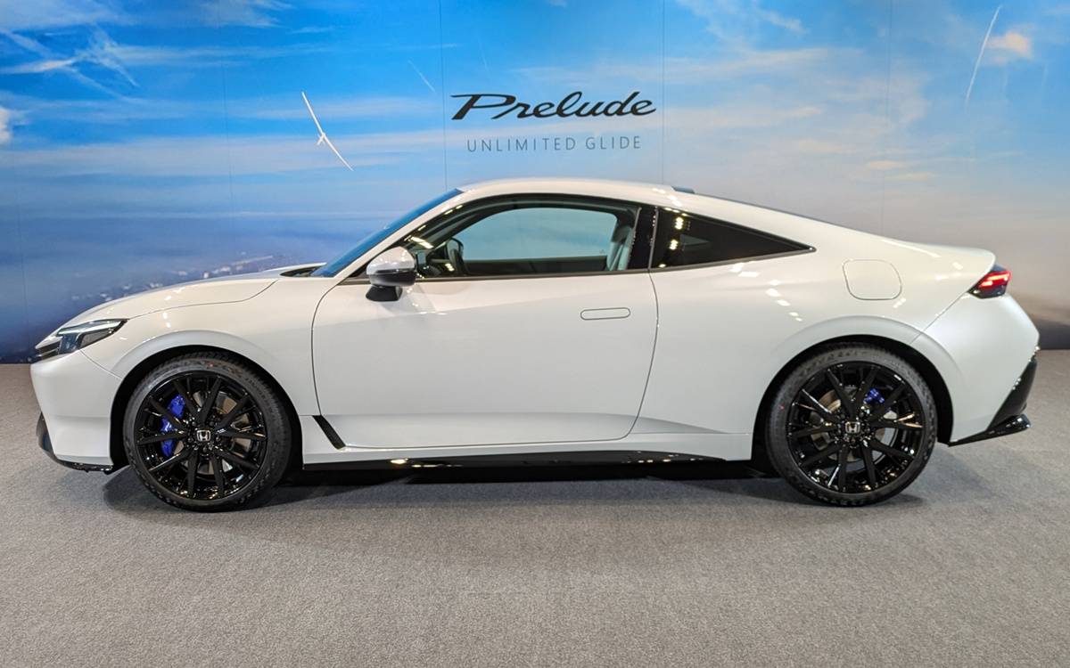 ด้านข้างหลังคาลาดลงพร้อมกระจกสีดำ กระจกมองข้างทรงสปูน ที่เปิดประตูเรียบเนียนกับตัวถัง ด้านท้ายพาดยาวด้วยไฟท้าย LED ติดตราตัวอักษร Honda เว้นช่อง มีตราโลโก้ Prelude สีดำ และล้ออัลลอยลายดำเข้มขนาด 19 นิ้ว พร้อมยาง 235/40R19 จาก Continental’s “Premium Contact 6” พร้อมคาลิปเปอร์เบรกหน้าหลังสีฟ้า และกันชนหลังทรงเท่