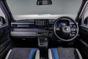 ภายในห้องโดยสารตกแต่งอย่างสนุกสนานด้วยเบาะนั่งทรงสปอร์ตที่โอบกระชับ ตัดด้วยสีน้ำเงิน และระบบไฟ Ambient Light ที่จะเปลี่ยนเป็นสีม่วงทันทีเมื่อกดปุ่มโหมด Boost เพื่อเข้าสู่การขับขี่แบบเต็มสมรรถนะ โดย Honda ระบุว่าระบบช่วงล่างได้รับการปรับจูนใหม่เป็นพิเศษเพื่อให้เหมาะกับสภาพถนนในอังกฤษและยุโรป ซึ่งจะมีความแข็งและหนึบกว่า N-One e: รุ่นมาตรฐานที่วางจำหน่ายในญี่ปุ่น