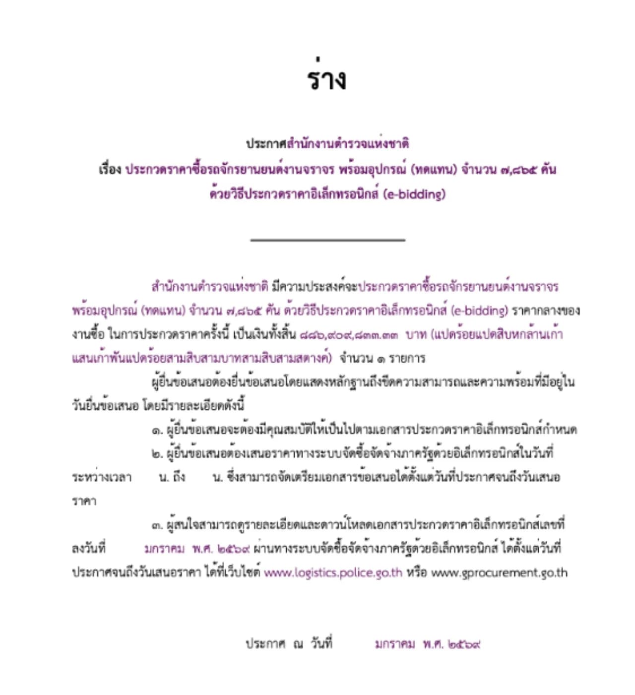 ซึ่งก่อนหน้านี้ ได้มีการจัดทำโครงการประกวดราคาจัดซื้อรถจักรยานยนต์งานจราจรพร้อมอุปกรณ์ทดแทน จำนวน 7,865 คัน ด้วยวิธี e-bidding โดยมีราคากลางรวมกว่า 886,909,833.33 บาท ซึ่งเป็นข้อมูลที่สำนักงานส่งกำลังบำรุง สำนักงานตำรวจแห่งชาติ เคยเผยแพร่ผ่านเว็บไซต์อย่างเป็นทางการ