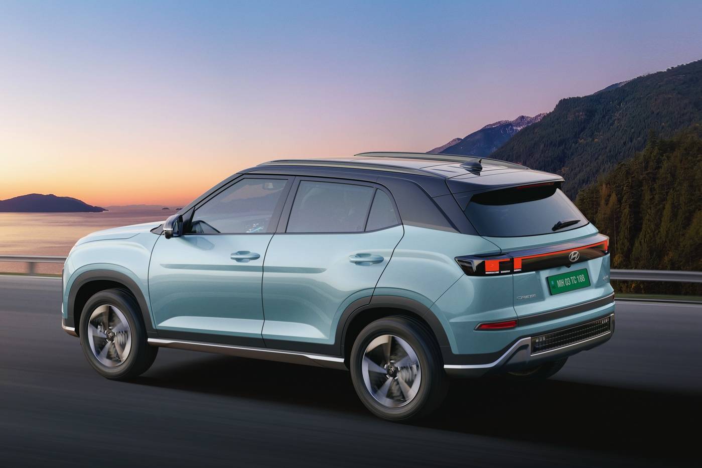 แต่งเข้มเหมือน CRETA เวอร์ชันสันดาปพร้อมสีภายนอก สีฟ้า Ocean Blue metallic ตัดกับโทนสีดำเสริมภาพลักษณ์คมเข้มและคล่องแคล่วยกระดับความมั่นใจในการขับขี่