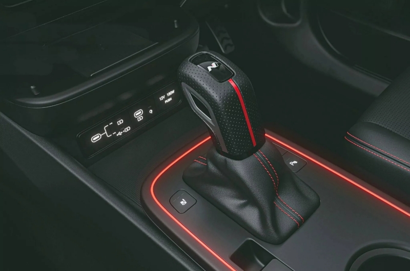 โลโก้ N ยังพบได้ที่หัวเกียร์และเบาะหนังสีดำ นอกจากนี้ Hyundai ยังเพิ่ม แป้นเหยียบโลหะ และไฟ Ambient Light สี “Sunrise Red”