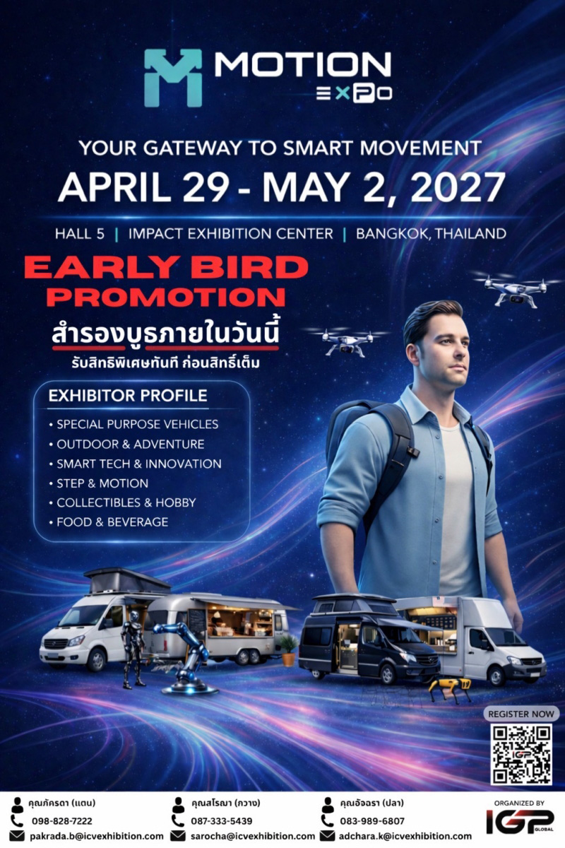Motion Expo งานแสดงนวัตกรรมและไลฟ์สไตล์การเคลื่อนที่แห่งอนาคต ภายใต้คอนเซ็ปต์ “Your Gateway to Smart Movement” ที่รวบรวมโลกของ “Mobility” ไว้ในที่เดียว ครอบคลุมตั้งแต่ยานยนต์สู่ทุกมิติของการใช้ชีวิต โดยผสาน Future Mobility, Outdoor & Adventure Lifestyle และ Smart Living Technology เพื่อสร้างแพลตฟอร์มที่เชื่อมโยงอุตสาหกรรม เทคโนโลยี และผู้บริโภค พร้อมยกระดับสู่เวทีธุรกิจและประสบการณ์ระดับภูมิภาค จัดขึ้นในวันที่ 29 เมษายน – 2 พฤษภาคม 2570 ณ ศูนย์แสดงสินค้าและการประชุม อิมแพ็ค เมืองทองธานี