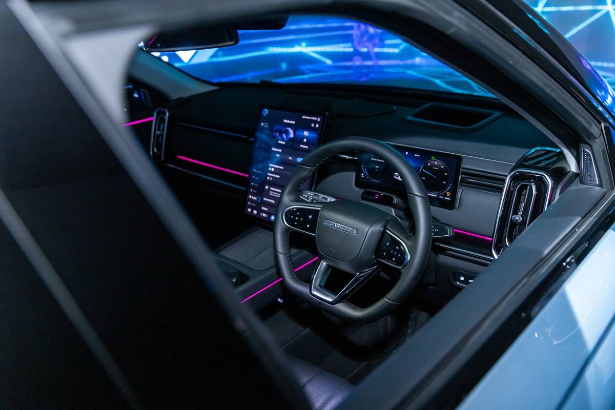 พร้อมลำโพง 8 จุด พวงมาลัยมัลติฟังก์ชันสามก้านทรงท้ายตัดแบบ Multi-Kinetic Flat-Bottom ปะตัวอักษร JAECOO จอแสดงผลบนกระจกหน้า AR-HUD ไฟสร้างบรรยากาศภายในห้องโดยสารหรือ Ambient Light มากถึง 64 สี ที่ชาร์จมือถือไร้สาย