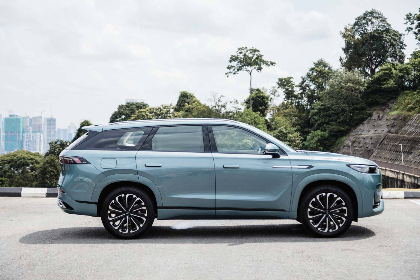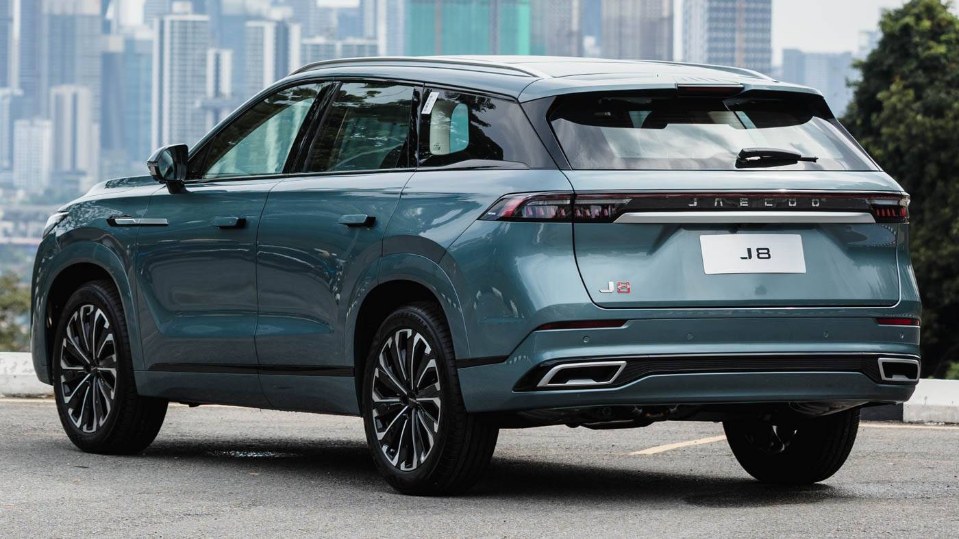 หลังคารถออกแบบอย่างเฉียบขาดพร้อมไฟท้าย LED แนวยาวประดับด้วยตัวอักษร JAECOO ประกบด้วยกันชนหลังทรงหรูด้วยตัวรถที่ใหญ่กว่าเพื่อนๆในค่าย ประตูท้ายไฟฟ้าแบบ powered tailgate พร้อมล้ออัลลอยขนาด 20 นิ้วพร้อมยาง 245/50 R20 จาก Maxxis Victra Sport 5 SUV ทำให้ตัวรถมี
