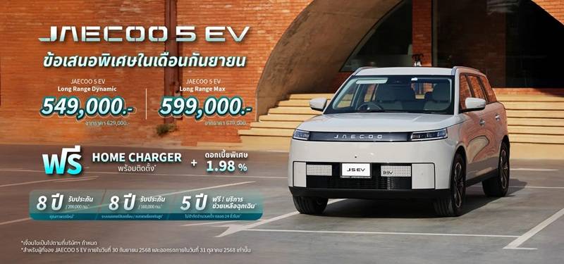 จากกระแสตอบรับที่เหนือความคาดหมาย ทางบริษัทฯ ได้ขยายโปรโมชันสำหรับ JAECOO 5 EV สำหรับลูกค้าที่จองรถระหว่างวันที่ 1-30 กันยายน 2568 และรับรถภายในวันที่ 31 ตุลาคม 2568 เมื่อจอง 5,000 บาท (จากเดิม Early Bird 1,000 บาท) คาดการณ์ยอดจองจะเกิน 8,000 คันภายในสิ้นปี 2568