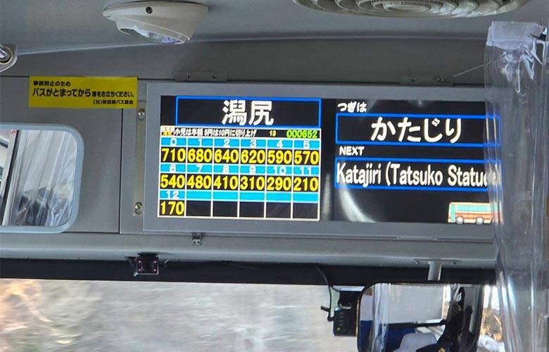 ค่าโดยสารจะขึ้นอยู่กับระยะทางที่เราเดินทาง สามารถเช็คราคาค่าโดยสารได้จากจอด้านหน้ารถ ให้เราดูตัวเลขค่าโดยสารที่ช่องตัวเลขที่ตรงกับตัวเลขบนตั๋วที่ได้รับมาตอนขึ้นรถ (ถ้าหากใช้ IC card ก็ไม่จำเป็นต้องเช็คราคาที่จอเพราะบัตรจะตัดเงินอัตโนมัติ) ยกตัวอย่างในรูป หากตั๋วกระดาษที่เราได้มาตอนขึ้นรถเป็นเลข 12 เราก็จ่ายเงินค่าโดยสาร 170 เยน