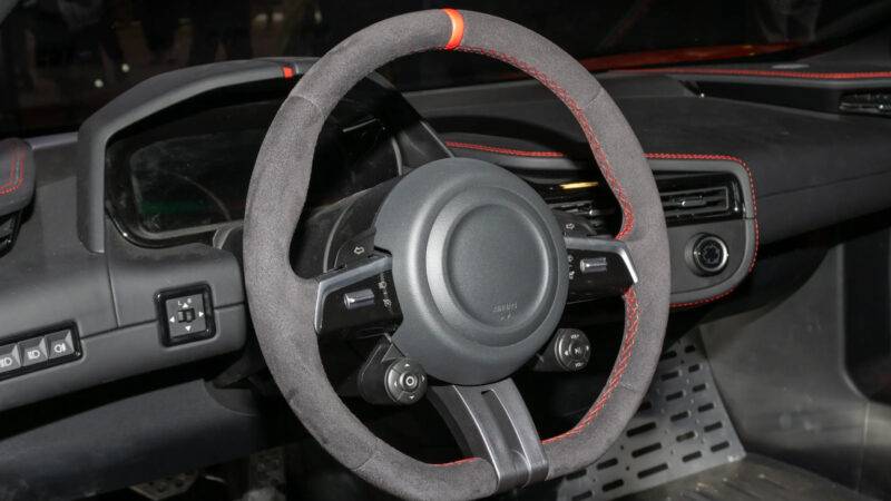 ภายในค่อนข้างเรียบง่าย ไม่มีหน้าจอขนาดใหญ่ เบาะนั่งใช้วัสดุคาร์บอนไฟเบอร์แบบสปอร์ต 2 ที่นั่งพร้อมที่รองศีรษะในตัวและส่วนรองรับด้านข้างที่โดดเด่น พวงมาลัยแบบสามก้านทรงตัว D ตั้งอยู่ด้านหน้าคนขับ มาพร้อมแผงหน้าปัดแบบ LCD