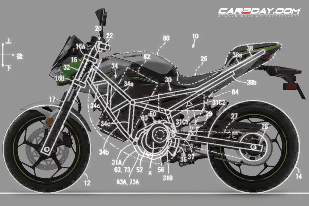 จากภาพสิทธิบัตร รถต้นแบบมีลักษณะคล้ายกับมอเตอร์ไซค์ไฟฟ้าของ Kawasaki ที่มีอยู่ในปัจจุบัน เช่น Z e-1 และ Ninja e-1 โครงสร้างหลักยังคงใช้ เฟรมเหล็กแบบ Trellis Frame และมีช่องสำหรับติดตั้งแบตเตอรี่แบบถอดเปลี่ยนได้อยู่ตรงกลางเฟรม ส่วนมอเตอร์และระบบส่งกำลังจะถูกติดตั้งบริเวณด้านหน้าของจุดหมุนสวิงอาร์ม ความแตกต่างสำคัญของสิทธิบัตรใหม่นี้คือ การเพิ่ม Subframe ระหว่างเฟรมหลักกับมอเตอร์