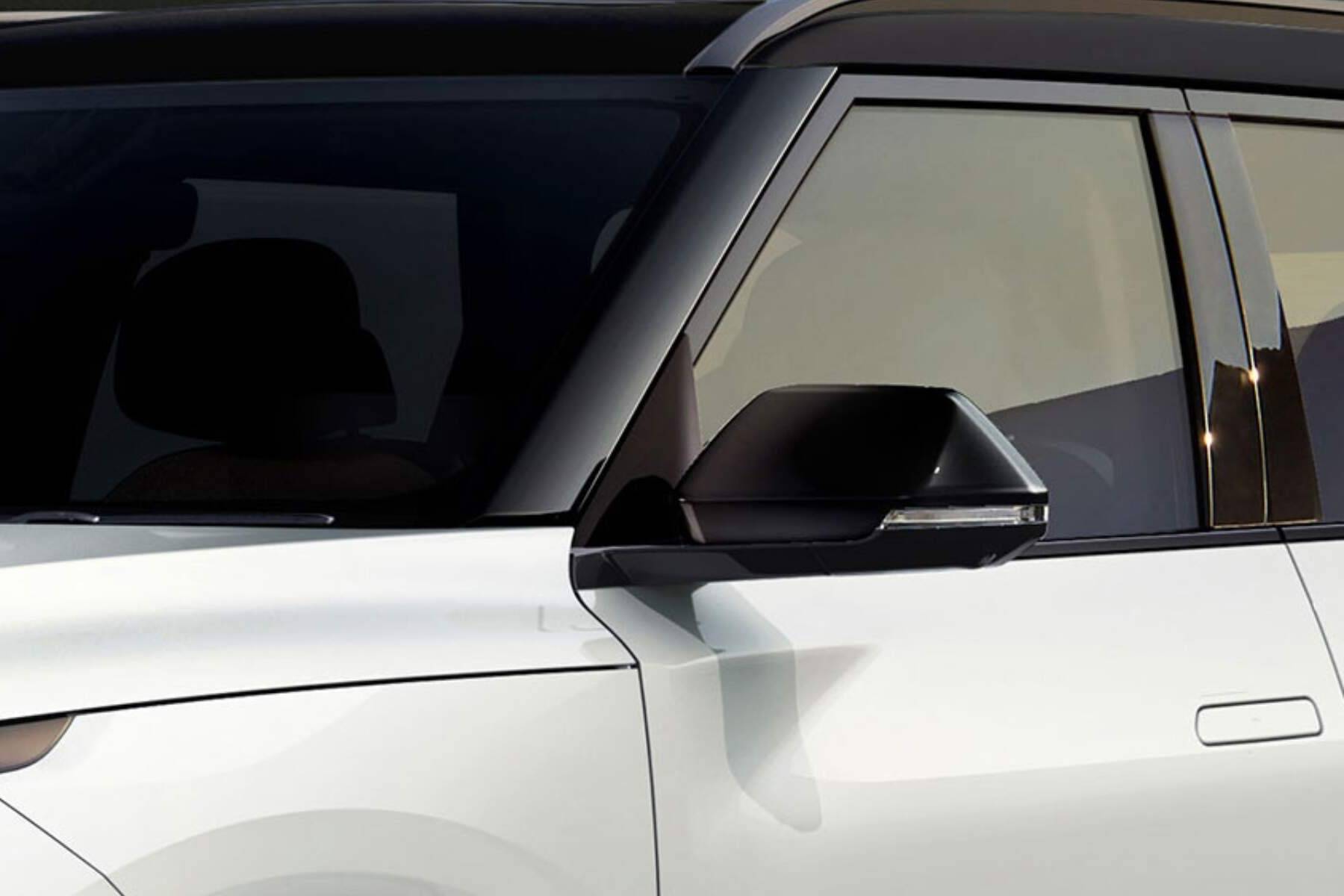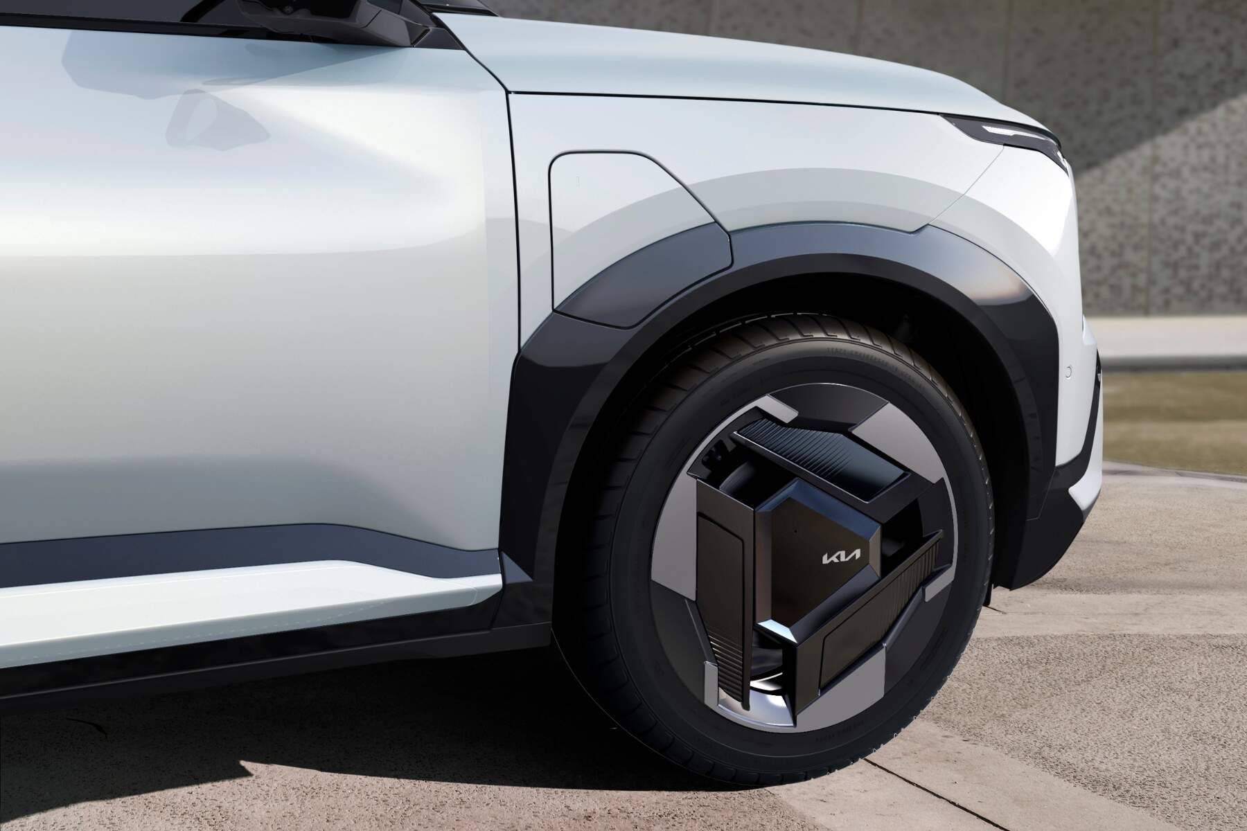 ซุ้มล้อและคิ้วชายล่างประตูตกแต่งสีดำที่เปิดประตูดีไซน์เรียบเนียนแบบ Flush type ทำงานอัตโนมัติตัวรถสร้างจากพื้นฐาน Electric Global Modular Platform (E-GMP) ตัวรถย่อลงจากเพื่อนร่วมค่ายอย่าง KIA EV9 ตั้งแต่