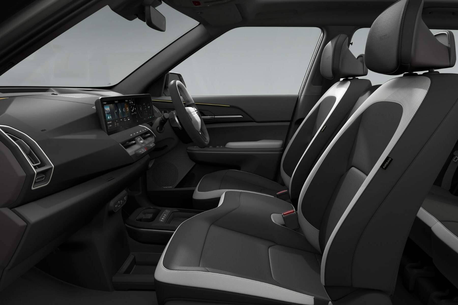 KIA EV5ภายในพิเศษกว่ารุ่นอื่นๆของ EV5 ด้วยพวงมาลัยมัลติฟังก์ชัน 3 ก้าน หุ้มหนังสีทูโทนขาวดำ เบาะนั่งหุ้มหนังสังเคราะห์ BIO PU ทูโทนสีขาวดำและแป้นคันเร่งกับเบรกตกแต่งแบบอลูมิเนียมสีเงิน