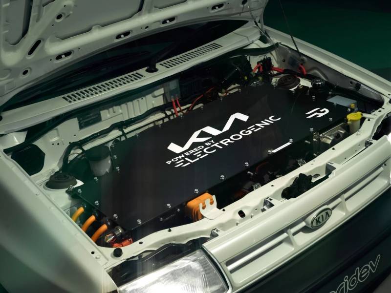 Kia และ Electrogenic เลือกใช้ระบบส่งกำลังแบบใหม่ที่ปล่อยมลพิษเป็นศูนย์แทนสันดาปภายใน แต่ยังคงใช้เกียร์ธรรมดา 5 สปีด และคาดว่าจะมีการปรับเปลี่ยนระบบเกียร์เพื่อให้เข้ากับคลัตช์ที่อัปเกรดใหม่ รองรับกำลัง 107 แรงม้า และแรงบิดสูงสุด 235 นิวตันเมตร และมีน้ำหนักเพียง 870 กก. รวมถึงน้ำหนักที่ลดลงอีก 20 กก. ในการเปลี่ยนมาใช้ระบบไฟฟ้า
