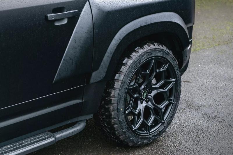 ฝากระโปรงหน้าคาร์บอนไฟเบอร์มีช่องระบายอากาศ 2 ช่อง พร้อมแถบไฟ LED แบบ double-pod เหนือกระจกหน้ารถ และสปอยเลอร์หลังคาแบบครีบคู่ แม้ตัวรถจะโหลดให้ต่ำลง แต่ Defender ก็ใส่ยาง all-terrain สำหรับบุกตะลุยไปทุกพื้นที่บนล้อฟอร์จขนาด 22 นิ้ว เมื่อรวมเข้ากับรูปลักษณ์ใหม่ทั้งหมดที่มีดีไซน์แบบกล่องอยู่แล้ว ทำให้ Defender คันนี้ตอกย้ำรูปลักษณ์แบบ Bank-Vault-on-Wheel อย่างแท้จริง โดยเฉพาะอย่างยิ่งด้วยสีดำซาติน