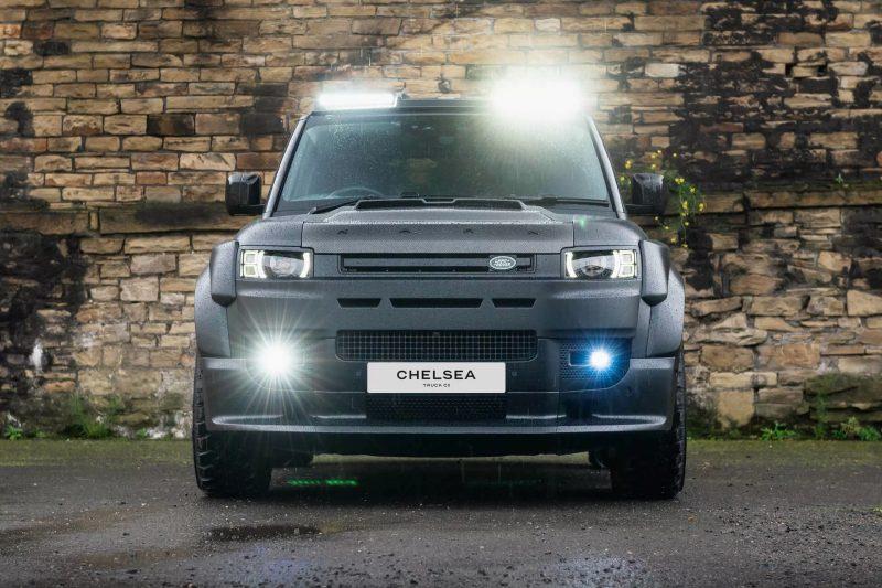 Defender ที่ได้รับการดัดแปลงนั้นถูกสร้างขึ้นเพื่อดึงศักยภาพของการปรับแต่งได้อย่างเต็มที่ Chelsea Truck ตกแต่ง Defender ด้วยชุดแต่งรอบคันแบบกว้าง ซึ่งปรับเปลี่ยนทุกอย่างตั้งแต่กันชนไปจนถึงไฟหน้า