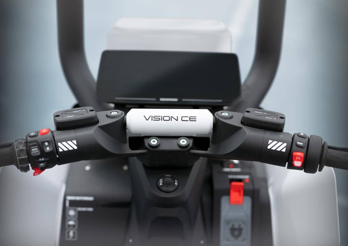 ดีไซน์ของสกู๊ตเตอร์รุ่นนี้ผสานโครงล่างเข้ากับโครงสร้างที่เปิดโล่งและโปร่งสบาย มีรูปลักษณ์ที่โฉบเฉี่ยว ฐานล้อที่ยาวช่วยเสริมภาพลักษณ์ที่ดึงดูดสายตาให้กับคอนเซ็ปต์ Vision CE โครงอะลูมิเนียมเคลือบสีขาวด้าน และไฮไลท์สีดำตัดกับสีแดงนีออน มอบสัมผัสที่เรียบง่ายแต่ทรงพลังให้กับสกู๊ตเตอร์รุ่นนี้