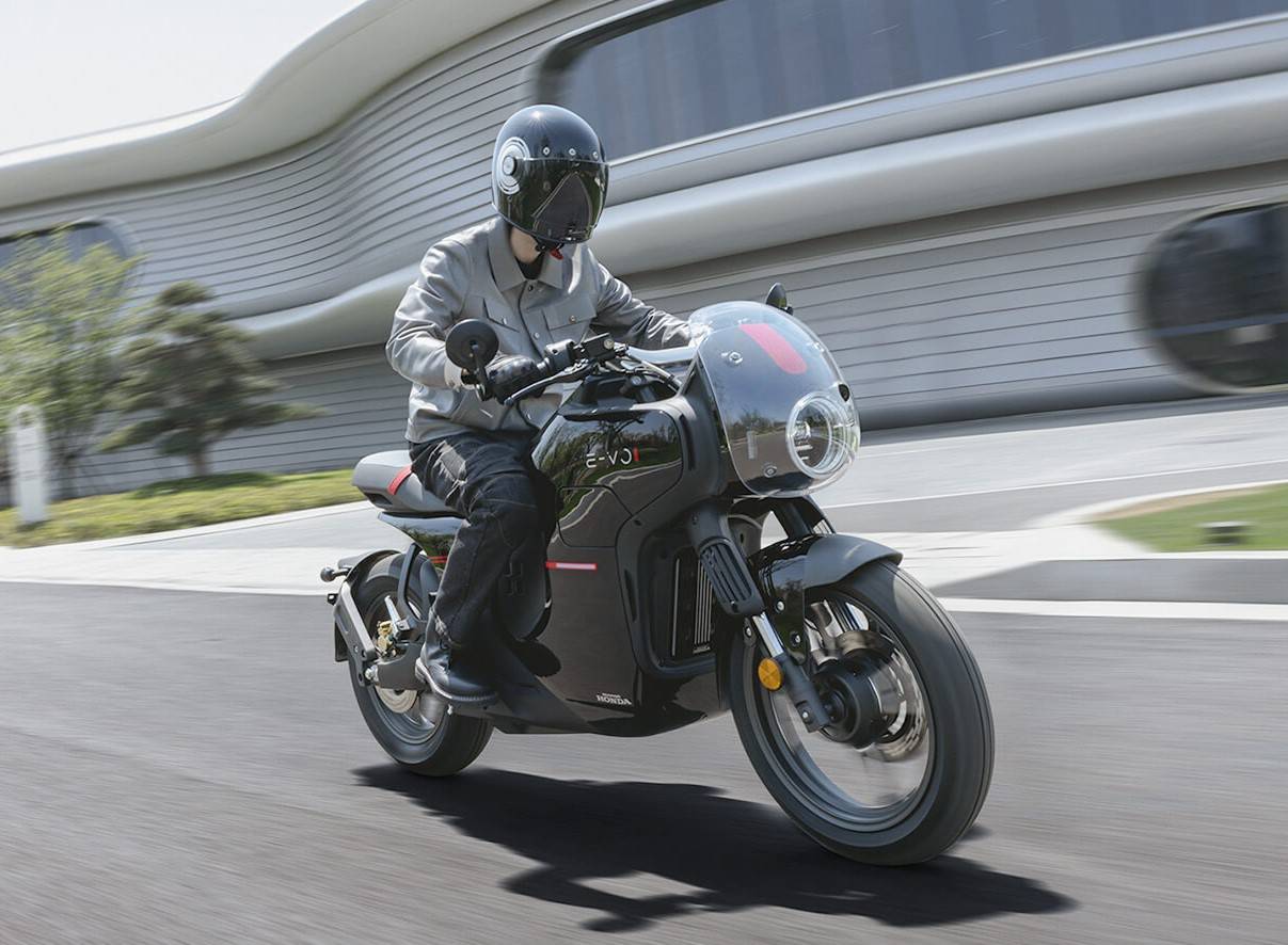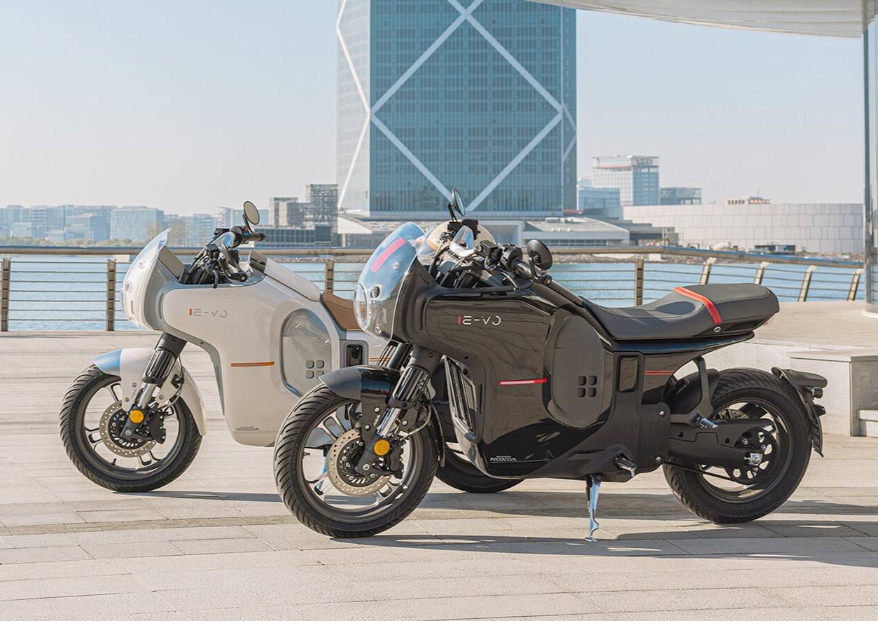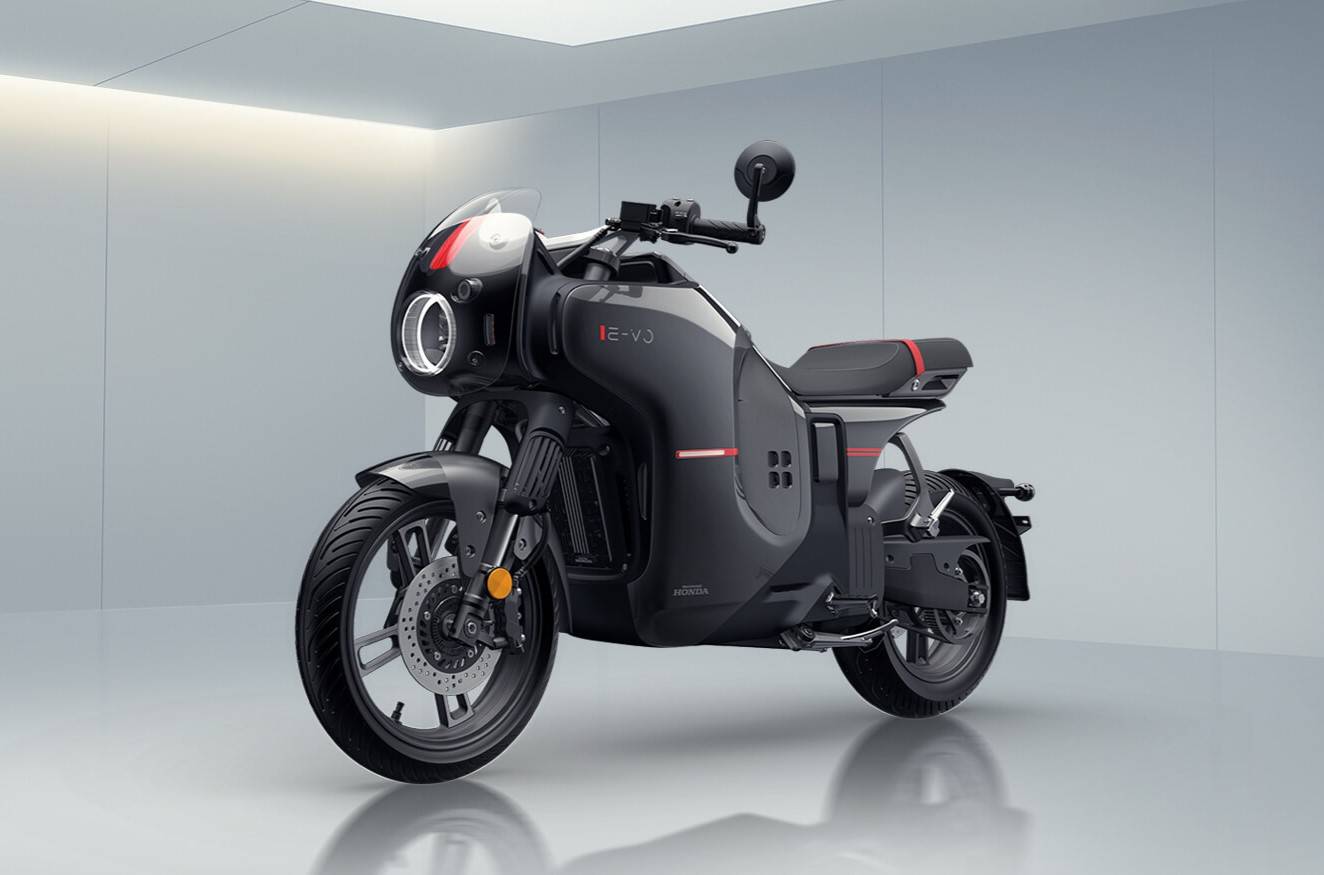 Honda E-VO มอเตอร์ไซค์ไฟฟ้าโดดเด่นด้วยดีไซน์คาเฟ่เรเซอร์สุดแหวกแนว พร้อมไฟหน้าทรงกลมที่ล้อมรอบด้วยแฟริ่งที่ให้กลิ่นอายย้อนยุคสไตล์ cafe racer ที่เน้นความคลาสสิกและเรียบง่าย โดยตรงกลางของตัวรถทรงกล่องซ่อนชุดแบตเตอรี่ไว้อย่างเรียบเนียน เข้ากันได้อย่างลงตัว ส่งผลให้รถดูสะอาดตา เติมเต็มลุคคาเฟ่เรเซอร์ให้สมบูรณ์ด้วย เบาะนั่งชิ้นเดียวแบบสองชั้น แฮนด์แบบคลิปออน และกระจกปลายแฮนด์