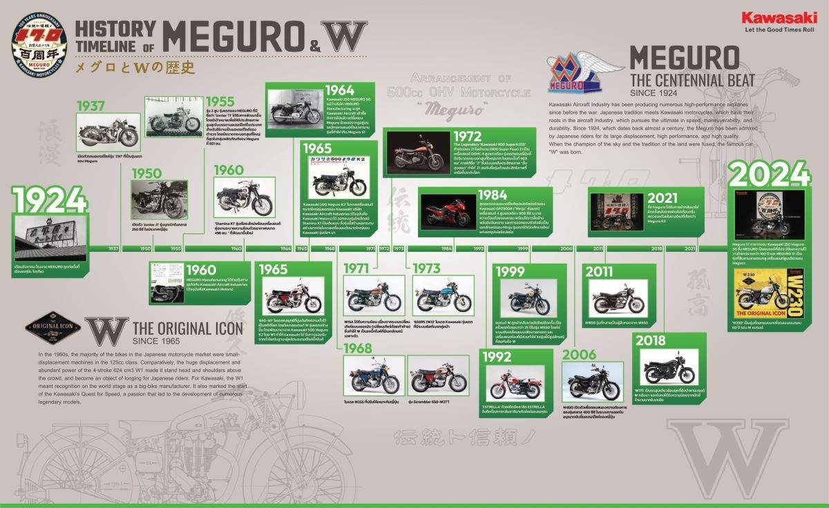 แบรนด์ MEGURO ก่อตั้งขึ้นเมื่อเดือนสิงหาคม ค.ศ.1924 ซึ่งเป็นช่วงเริ่มต้นของอุตสาหกรรมมอเตอร์ไซค์ของญี่ปุ่น โดยแบรนด์นี้วางรากฐานให้กับรถจักรยานยนต์สปอร์ตที่มีเครื่องยนต์ขนาดใหญ่ที่ผลิตในญี่ปุ่น และมีบทบาทอย่างมากในวงการแข่งรถ ซึ่งได้เข้าร่วมการแข่งขันหลายรายการและได้รับผลงานที่ยอดเยี่ยมเมื่อเทียบกับคู่แข่งรถจักรยานยนต์บิ๊กไบค์ที่ผลิตในต่างประเทศ