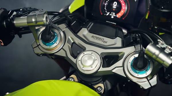 ในส่วนของตำแหน่งแฮนด์นี้ต่ำลง 69 มม. และอยู่ด้านหน้ามากขึ้น 52 มม. เมื่อเทียบกับ Speed Triple รุ่นมาตรฐาน อย่างไรก็ตามพักเท้าที่สูงขึ้น 14.5 มม. และอยู่เยื้อยงด้านหลังมากขึ้น 25.5 มม. ทำให้มีน้ำหนักที่เพิ่มขึ้นที่ด้านหน้าและแรงงัดที่ลดลงจากคลิปออน ไทรอัมพ์ อัปเกรดแดมเปอร์แฮนด์ จากแบบพาสซีฟเป็น Ohlins SD EC แบบอิเล็กทรอนิกส์ ซึ่งเชื่อมต่อกับระบบควบคุมอิเล็กทรอนิกส์แบบเดียวกับที่ใช้ในระบบกันสะเทือนกึ่งแอคทีฟ Ohlins Smart EC3 ซึ่งใช้ในทั้ง RX และ RS
