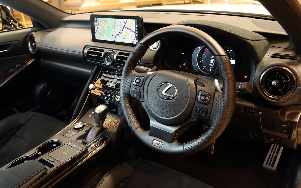 ภายในพิเศษด้วยชุดลายไม้ แบบ open finish / red iron oxide สีแดง/น้ำตาลเข้ม ที่วงพวงมาลัย แผงสวิตช์กระจกไฟฟ้า 4 บาน และเพลตบอกชื่อรุ่น นอกนั้นคงเดิมทั้ง มาตรวัดดิจิทัล 8 นิ้ว แบบ TFT มีโลโก้ F Sport รวมถึง สครัพเพลตตรงประตู ติดโลโก้ F Sport ด้วยเช่นกัน เบาะนั่งคู่หน้าทรงสปอร์ต มาพร้อมฟังก์ชันอุ่นเบาะปรับด้วยไฟฟ้าพร้อมความจำด้านคนขับ เบาะนั่งหลัง แผงประตู ฝาครอบมาตรวัด ที่ท้าวแขนบนคอนโซลกลาง พวงมาลัยมัลติฟังก์ชันสามก้านและด้ามจับคันเกียร์ ทั้งหมดนี้หุ้มหนังกลับแบบ Ultrasuede สีดำ จาก Toray Industries ชุดแป้นคันเร่ง แป้นเบรก และที่พักเท้าดีไซน์พาะรุ่น บนพื้นฐานเดิมทั้ง จอสัมผัสออกใหญ่ขึ้น 10.3 นิ้ว รองรับ Apple Carplay และ Android Auto พร้อมลำโพงขั้นเทพจาก Mark Levinson 17 จุด ด้วยกำลังขับ 1,800 วัตต์