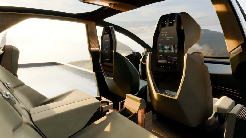 พื้นรถที่ เรียบสนิท ย้ำให้เห็นชัดเจนว่านี่คือรถ EV โดยมีวัสดุตกแต่งด้วยไม้ ไม้ไผ่ ซึ่งสะท้อนถึงการตกแต่งที่พบใน LS มินิแวน เบาะคนขับสีฟ้า ดูโดดเด่นตัดกับเบาะผู้โดยสารสีครีม ขณะที่พวงมาลัยถูกแทนที่ด้วย Yoke (พวงมาลัยทรงเครื่องบิน) และแทบไม่มีปุ่มควบคุมแบบดั้งเดิมเลย แม้ว่าปุ่มควบคุมกระจกดูเหมือนจะถูกติดตั้งไว้ที่มุมซ้ายด้านหน้าของเบาะผู้โดยสารด้านหน้าแทน