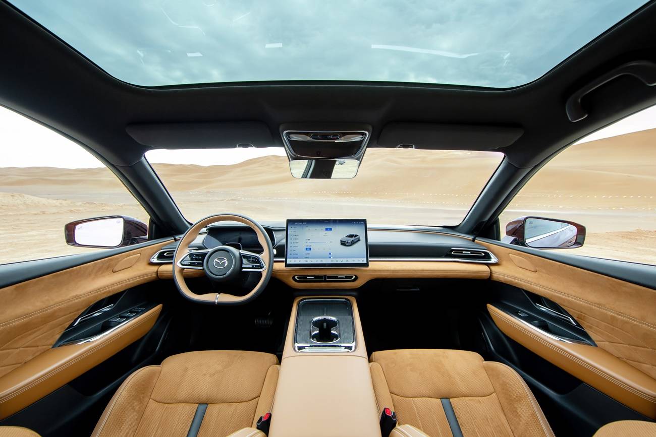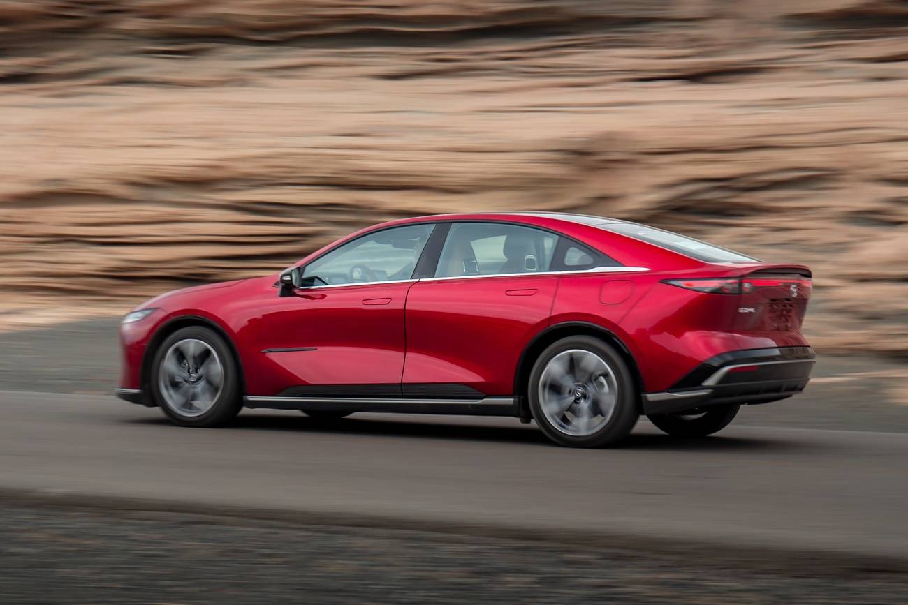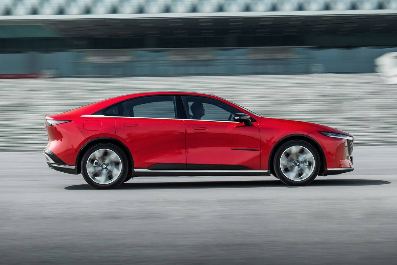 ด้านข้างตัวรถบริเวณบังโคลนตกแต่งสปอร์ต คิ้วชายล่างโครเมียมใต้ขอบประตู ที่เปิดประตูดีไซน์เรียบเนียนกับตัวถังรถไฟท้าย LED ดีไซน์เพรียวแนวยาวแบบ Star Flame พร้อมสปอยเลอร์ที่สามารถยกปีกออกมาแบบอัตโนมัติ พร้อมตราโลโก้ Mazda ฝาท้ายเปิด-ปิดด้วยระบบไฟฟ้า และล้ออัลลอยขนาด 19 นิ้ว พร้อมยาง 245/45R19 เก๋งลูกครึ่งญี่ปุ่น-จีน