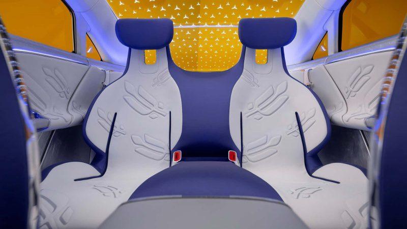 ภายใน CLA Concept รับต้นแบบมาจาก Vision EQXX รวมถึงวัสดุที่ยั่งยืนและจอแสดงผล Superscreen สุดไฮเทค เบาะนั่งสีเงินและสีขาวทำจากหนัง Nappa ที่ผ่านการฟอกโดยใช้เปลือกกาแฟ ซึ่งเป็นผลพลอยจากของที่ใช้ไม่ได้ของอุตสาหกรรมเครื่องดื่ม และผ้าเน้นสีม่วงแวววาวทำจากพลาสติก PET รีไซเคิล แถบผ้าไหมที่ปลูกในห้องแล็บปรากฏอยู่ในช่องประตู พรมปูพื้นทำจากไม้ไผ่ ส่วนที่ดึงประตูและที่วางแขนสีเงินซาตินทำจากกระดาษรีไซเคิล องค์ประกอบสไตล์ที่สนุกสนาน ได้แก่ พวงมาลัย Benz laurel แบบคลาสสิก ที่ได้รับการขยายขนาดและปักลงบนเบาะนั่ง