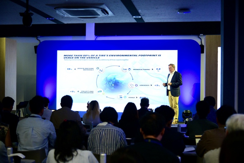 ซีริลล์ โรเฌต์ (Cyrille Roget) ผู้อำนวยการฝ่ายนวัตกรรมและการสื่อสารเชิงวิทยาศาสตร์ของมิชลิน นำเสนอความก้าวหน้าล่าสุดของกลุ่มมิชลินในการออกแบบยางล้อที่ยั่งยืน พร้อมเน้นย้ำถึงความสำคัญของการประเมินวงจรชีวิตผลิตภัณฑ์ การใช้วัสดุชีวภาพ และการเพิ่มประสิทธิภาพแรงต้านทานการหมุน เขาชี้ให้เห็นว่า กว่า 80% ของผลกระทบต่อสิ่งแวดล้อมของยางล้อเกิดขึ้นระหว่างการใช้งาน ตอกย้ำถึงความจำเป็นในการให้ความสำคัญกับการออกแบบอย่างรอบด้านและกระบวนการผลิตที่มีความรับผิดชอบต่อสิ่งแวดล้อม