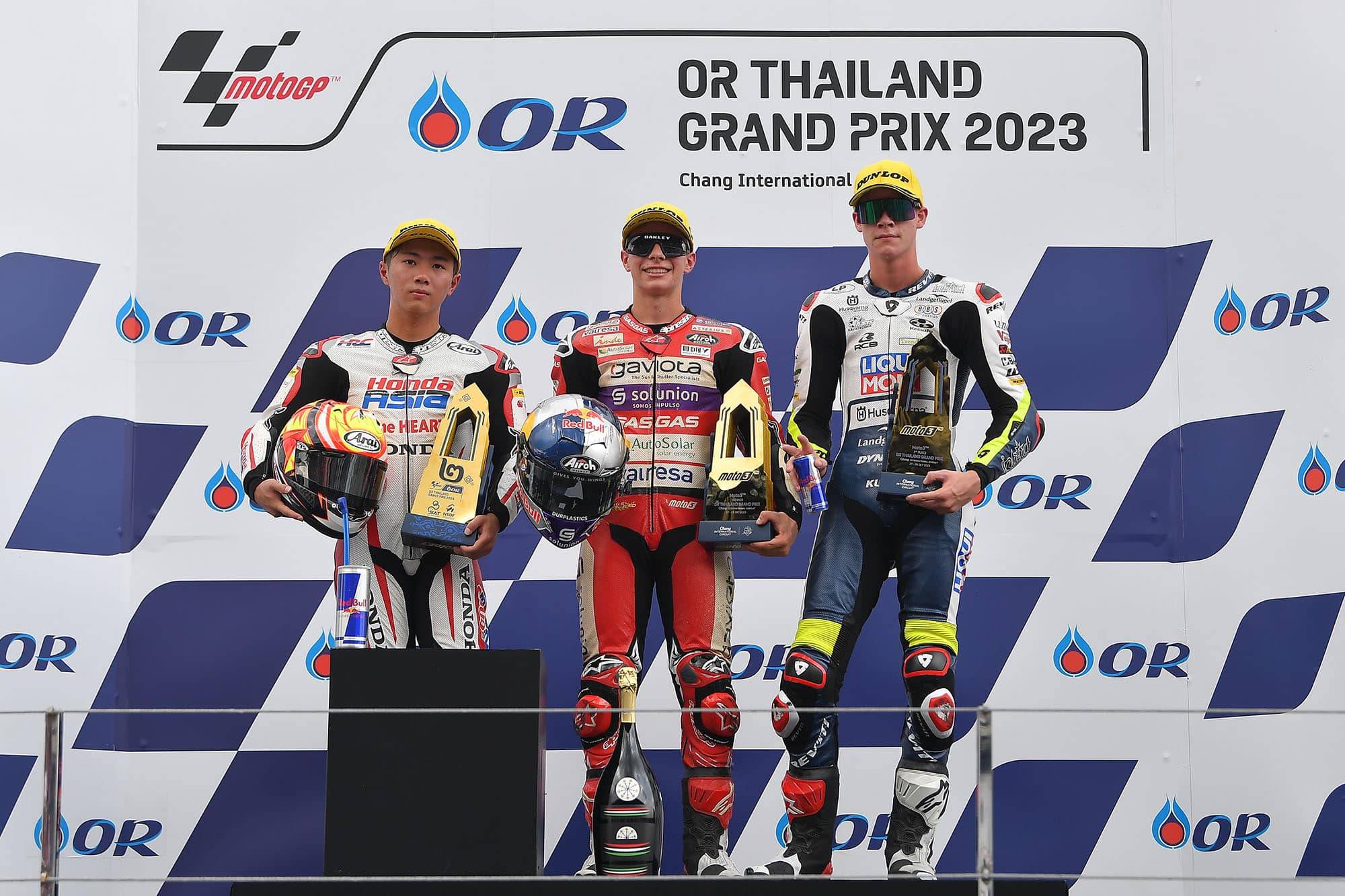 ส่วนนักบิดดาวรุ่งชาวไทยที่ลงบิดด้วยสิทธิ์ไวลด์การ์ดในรุ่น โมโตทรี เวิลด์ แชมเปี้ยนชิพ ปรากฏว่า “ไอเดีย” กฤตภัทร เขื่อนคำ จาก ยามาฮ่า ไทยแลนด์ เรซซิ่ง – โบเอ บิดเข้าป้ายอันดับ 27 ตามด้วย “ก๊องส์” ธัชกร บัวศรี จาก ฮอนด้า ทีม เอเชีย ในอันดับ 28