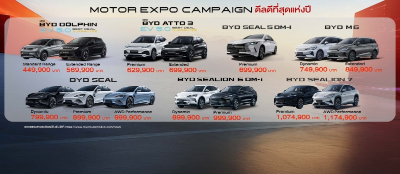 BYD ATTO 3 – สำหรับรุ่นย่อย Premium ราคาพิเศษ 629,900 บาท หรือ 639,900 บาท พร้อมโฮมชาร์จเจอร์2 สำหรับรุ่นย่อย Extended ราคาพิเศษ 699,900 บาท หรือ 709,900 บาท พร้อมโฮมชาร์จเจอร์ ทั้งสองรุ่นย่อย ฟรี ประกันภัยชั้น 1 นาน 1 ปี และฟิล์มเซรามิก