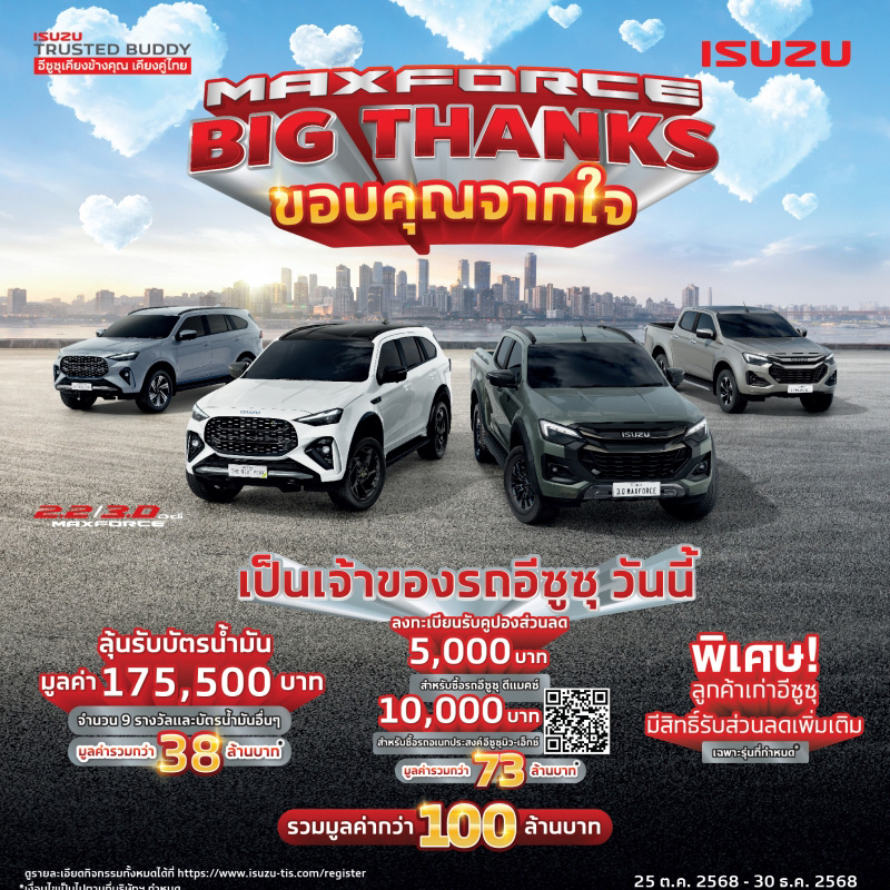 แคมเพจ์นขอบคุณลูกค้าสุดยิ่งใหญ่ “MAXFORCE BIG THANKS ขอบคุณจากใจ” มอบสิทธิ์ลุ้นรับบัตรน้ำมัน PT สำหรับลูกค้าที่ซื้อและรับรถปิกอัพอีซูซุ ดีแมคซ์ ทุกรุ่น หรือรถยนต์นั่งอเนกประสงค์มิว-เอ็กซ์ ทุกรุ่น ตั้งแต่วันที่ 25 ตุลาคม – 30 ธันวาคม 2568 จับรางวัลจำนวน 9 สัปดาห์ โดยมีรายละเอียดรางวัล ดังนี้