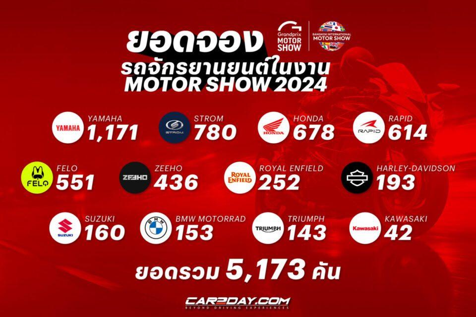สิ้นสุดเป็นที่เรียบร้อยร้อยแล้วกับงาน Bangkok International Motor Show 2024 โดยในปีนี้มียอดจำหน่ายรถจักรยานยนต์ทั้งสิ้น 5,173 คัน