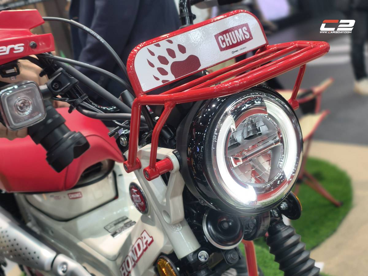 New Honda CT125 CHUMS Limited Edition โดดเด่นด้วยแร็คไฟหน้าสีแดงสดใส และกราฟิกรอยเท้าหมี Grizzly สุดน่ารักที่สื่อถึงอิสรภาพของนักเดินทาง อีกทั้งโดดเด่นด้วยเบาะหนังสีแดงสด คัสตอมพิเศษ เข้าชุดกับตัวรถสีขาวอย่างลงตัว พร้อมประทับโลโก้ CHUMS เพื่อยกระดับความพรีเมียม เสริมด้วยชุดการ์ดแฮนด์ Barkbusters ที่พร้อมออกผจญภัยได้ทุกเส้นทาง
