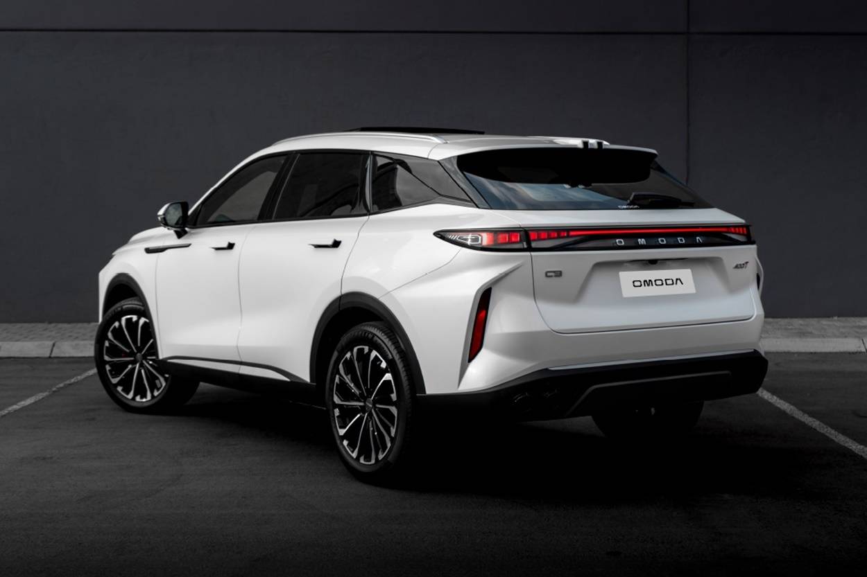 ไฟท้าย LED แนวยาวประดับด้วยตัวอักษร OMODA ประกบด้วยกันชนหลังทรงหรูด้วยตัวรถที่ใหญ่กว่าพร้อมไฟทับทิมแนวตั้งพร้อมคิ้วเสริมกันชนหลังสีเงินเส้นเล็กในชุดลิ้นสปอยเลอร์กันชนหลังเสริมหล่อเสริมหรู ประตูท้ายไฟฟ้าแบบ Powered Tailgate พร้อมล้ออัลลอยเลือกได้ทั้งขนาด 19 นิ้วพร้อมยาง 235/55 R19 กับ 20 นิ้วพร้อมยาง 245/50 R20 ตัวรถใหญ่แบบทรงกล่องหลังคาลาดไซซ์กลางตั้งแต่