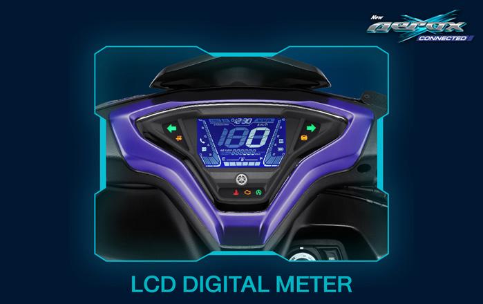 - New! LCD DIGITAL METER ใหม่! เรือนไมล์ดิจิทัลแบบ LCD กราฟิกสไตล์สปอร์ตบอกครบทุกฟังก์ชัน แสดงผลการเชื่อมต่อกับ Y-CONNECT พร้อมสวิตซ์เปลี่ยนโหมดง่ายขึ้นที่แฮนด์ซ้าย