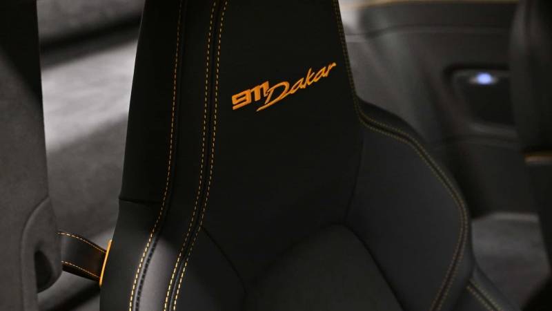 สีสันเหล่านี้ขยายไปถึงภายในด้วยสีเหลือง Signal Yellow ที่ตัดกับคอนโซลกลาง แผงหน้าปัด และแผงประตู โลโก้ 911 Dakar เย็บเข้ากับพนักพิงศีรษะด้านหน้าของ Sports Seats Plus ด้วยสีเดียวกัน และแม้แต่คันเกียร์ก็ยังมีการเน้นสีเหลือง Signal Yellow ที่ละเอียดอ่อน
