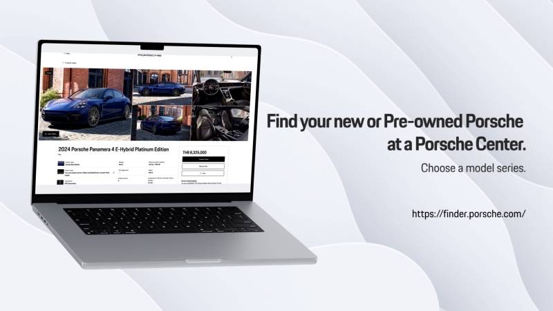 Porsche Finder แพลตฟอร์มค้นหารถยนต์ Porsche อย่างเป็นทางการ ทั้งรุ่นใหม่และรถยนต์ Porsche Pre-owned ที่เต็มเปี่ยมด้วยคุณภาพ เพื่อมอบประสบการณ์การค้นหาและเป็นเจ้าของรถยนต์ปอร์เช่ในฝันที่ง่าย สะดวก และตรงใจผู้ใช้งานมากยิ่งขึ้น เพียงปลายนิ้วสัมผัส