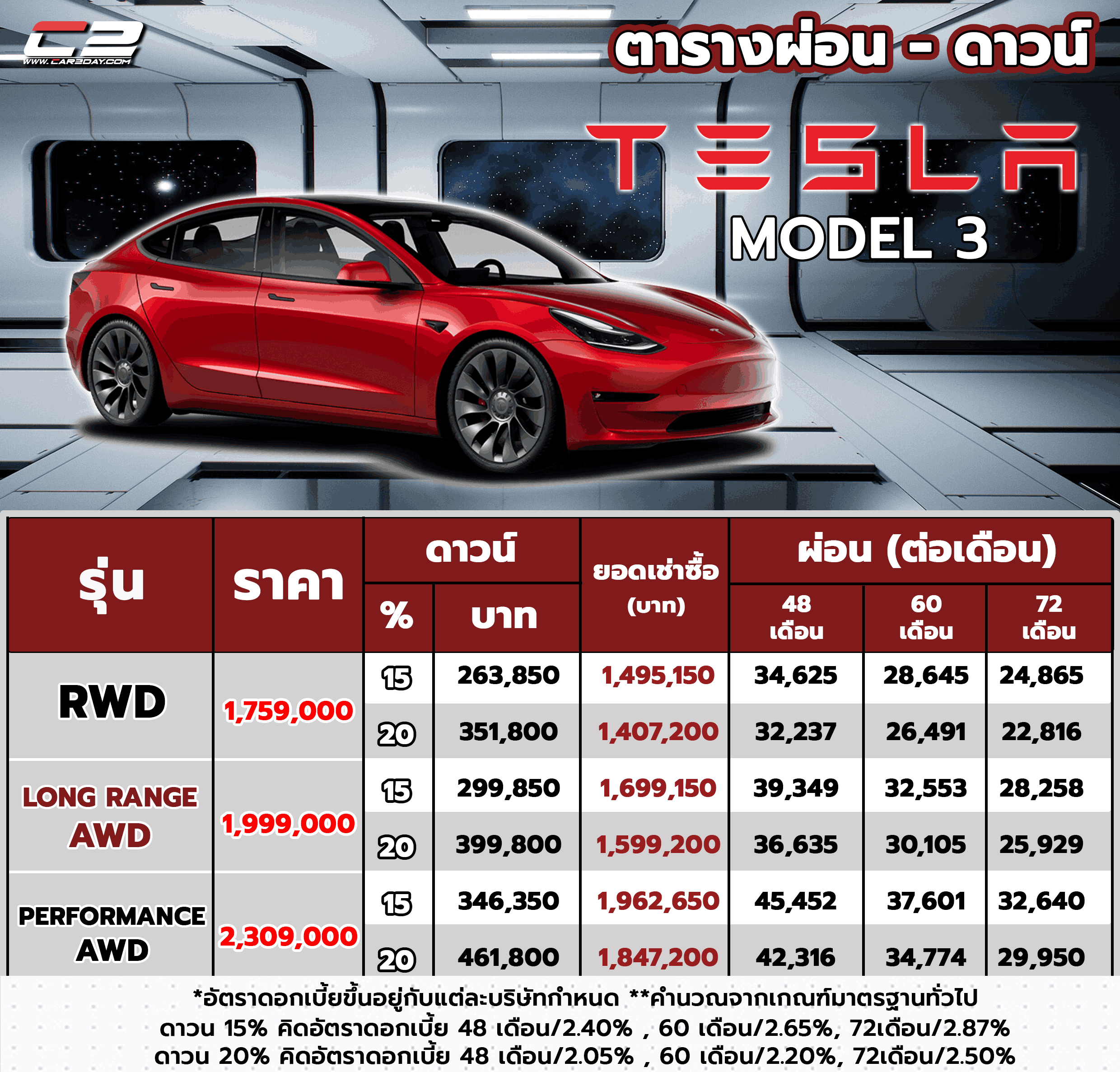 ตารางผ่อน – ดาวน์ 2022 Tesla Model 3 ทุกรุ่นย่อย