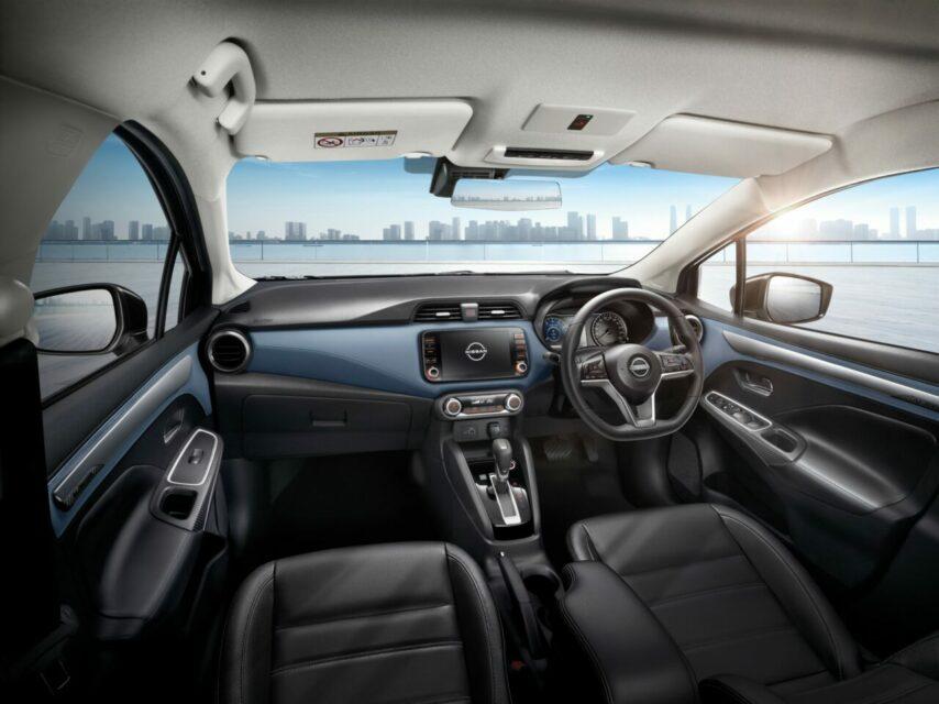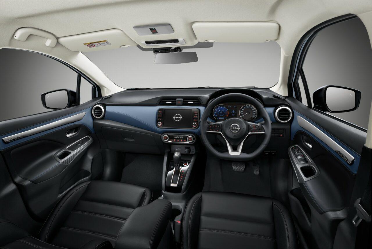 ดีไซน์ภายใน ยังคงเดิม แต่ปรับเปลี่ยนเล็กน้อยตั้งแต่การตกแต่งที่แผงคอนโซลหน้าซึ่งเป็นรูปปีกที่สยายออกพร้อมวัสดุสีน้ำเงินเข้ม (ในรุ่น V และ VL) ตลอดแนวคอนโซลเพิ่มความเก๋ทันสมัยเสริมอารมณ์สปอร์ตให้กับห้องโดยสาร พวงมาลัยมัลติฟังก์ชันท้ายตัดสามก้านติดตั้ง Cruise Control ใหม่และปะโลโก้ Nissan เวอร์ชันใหม่มาด้วย จอสัมผัสขนาดใหญ่ 8 นิ้ว พร้อมระบบอินโฟเทนเมนต์ล่าสุด NissanConnect รองรับการเชื่อมต่อผ่านสมาร์ทโฟนทั้ง Android Auto และ Apple CarPlay รวมทั้งยังสามารถใช้ระบบนำทางผ่าน Google Map ได้สบาย ๆ และระบบสั่งงานด้วยเสียงอัจฉริยะ เพิ่มความสุนทรีย์ในทุกการเดินทางด้วยลำโพงมากสุด 6 จุด