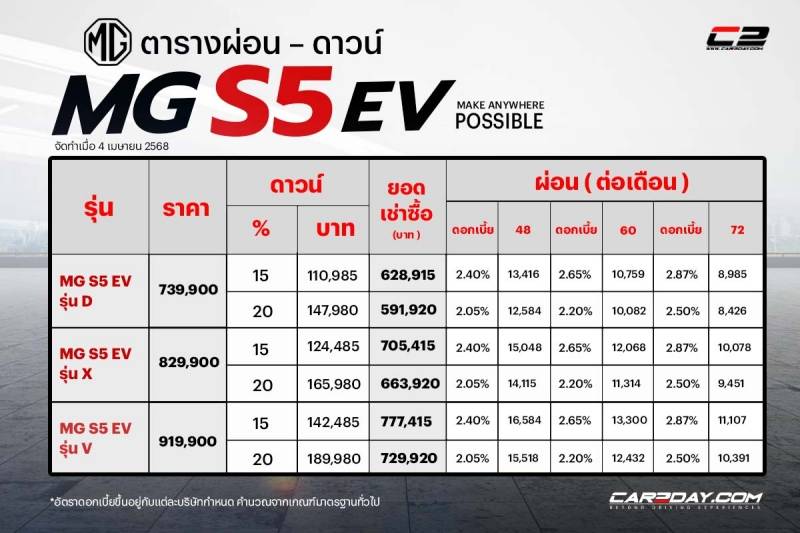 ตารางผ่อน MG S5 EV ราคาเริ่มต้น 739,900 – 949,900 บาท ผ่อนเริ่มต้น 8,426 บาท