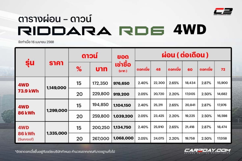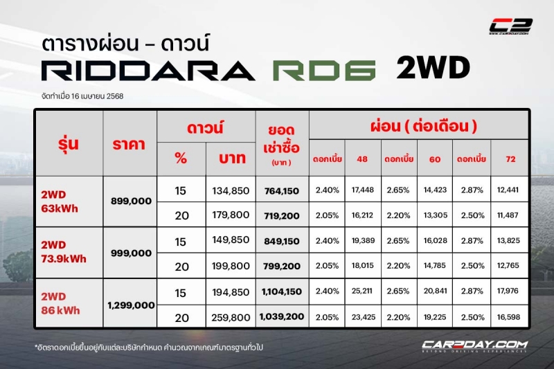 ตารางผ่อน – ดาวน์ RIDDARA RD6 4WD