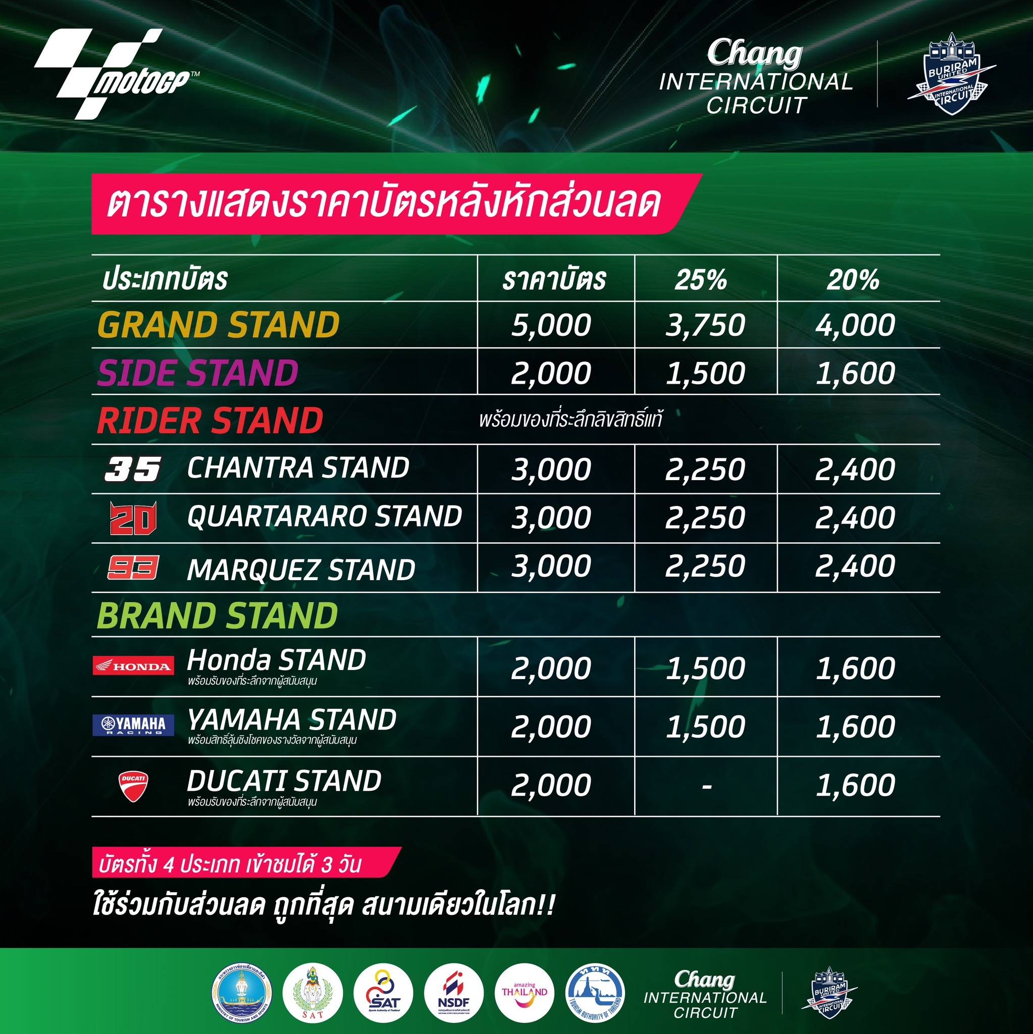 1.แกรนด์ สแตนด์ 5,000 บาท (เห็นทุกโค้งทั่วสนาม) ราคาหลังหักส่วนลดสูงสุด 25 % เหลือเพียง 3,750 บาท