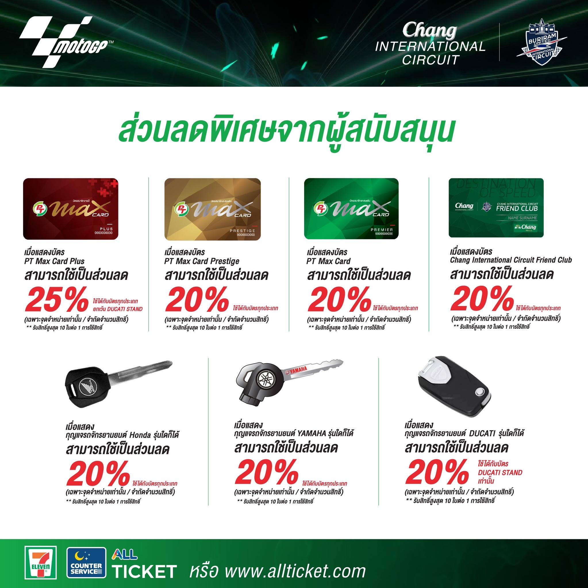 นอกจากนี้ยังสามารถรับส่วนลด 20% เมื่อแสดงบัตร PT Max Card Prestige หรือ บัตร PT Max Card หรือใช้สิทธิ์ส่วนลดจากผู้สนับสนุนอื่นๆ ได้แก่ Chang International Circuit Friend Club, กุญแจรถจักรยานยนต์ Honda, กุญแจรถจักรยานยนต์ YAMAHA ส่วนกุญแจรถจักรยานยนต์ DUCATI ใช้เป็นส่วนลด 20% ได้เฉพาะแสตนด์ดูคาติเท่านั้น (สงวนสิทธิ์เลือกใช้ส่วนลดได้เพียงอย่างใดอย่างหนึ่ง) และข่าวดีสำหรับยามาฮ่า สแตนด์ ซื้อบัตรทุกที่นั่ง ลุ้นรับ รถจักรยานยนต์ยามาฮ่า R15M Connected-ABS รุ่นปี 2024 จำนวน 1 คัน มูลค่า 138,000 บาท