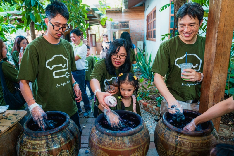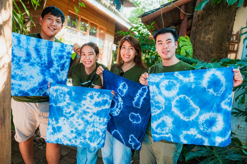 จากนั้นเดินทางต่อไปยัง “บ้านมัดใจ” บ้านเรือนไม้โอบล้อมด้วยพันธุ์ต้นไม้น้อยใหญ่ ที่ใช้สอนย้อมฮ่อมและเป็นคาเฟ่สไตล์โฮมเมด โดยที่นี่เราได้ทำกิจกรรม Workshop ผ้ามัดย้อมฮ่อม หรือผ้ามัดย้อมคราว สไตล์เมืองแพร่ โดยรับฟังการอธิบายวิธีสร้างลายบนผ้าเบื้องต้น ด้วยการมัด หนีบ ด้วยหนังยาง และนำไปจุ่มในม่อฮ่อนสีน้ำเงิน โดยเลือกสีอ่อน เข้มได้ ตามระยะเวลาในการจุ่มผ้า แม้เป็นกิจกรรมช่วงสั้นๆ แต่สร้างความสนุกสนานและตื่นเต้นกับการเห็นลวดลายบนผ้าในสไตล์ตัวเองที่มีผืนเดียวในโลก
