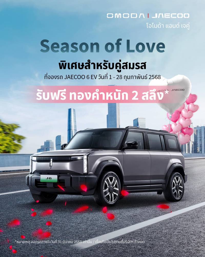 ข้อเสนอพิเศษที่ 3 JAECOO 6 EV Season of Love สำหรับคู่สมรสที่จองรถ JAECOO 6 EV รับฟรีทองคำ 2 สลึง เมื่อออกรถภายในวันที่ 31 มี.ค. 68 เท่านั้น และเงื่อนไขเป็นไปตามที่บริษัทฯ กำหนด