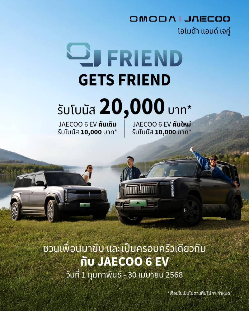 ข้อเสนอพิเศษที่ 4 OJ Friend gets Friend เมื่อชวนเพื่อนมาซื้อรถ JAECOO 6 EV รับโบนัสรวม 20,000 บาท 10,000 สำหรับ JAECOO 6 EV คันเก่า และ 10,000 สำหรับ JAECOO 6 EV คันใหม่* ตั้งแต่วันที่ 1 ก.พ. – 30 เม.ย. 68