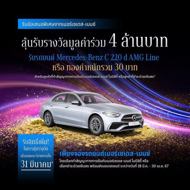 และข้อเสนอสุดยิ่งใหญ่จากเมอร์เซเดส-เบนซ์ โมบิลิตี้ ลุ้นรับรถเมอร์เซเดส-เบนซ์ C 220 d AMG Line มูลค่า 2,880,000 บาท พร้อมชิงทองคำหนักรวม 30 บาท มูลค่ารวมทั้งสิ้น 4 ล้านบาท เมื่อจองรถยนต์ใหม่เมอร์เซเดส-เบนซ์ และทำสัญญาทางการเงินกับเมอร์เซเดส-เบนซ์ โมบิลิตี้ ระหว่างวันที่ 18 มีนาคม – 30 เมษายน 2567 พร้อมเริ่มต้นสัญญาทางการเงินภายในวันที่ 30 มิถุนายน 2567