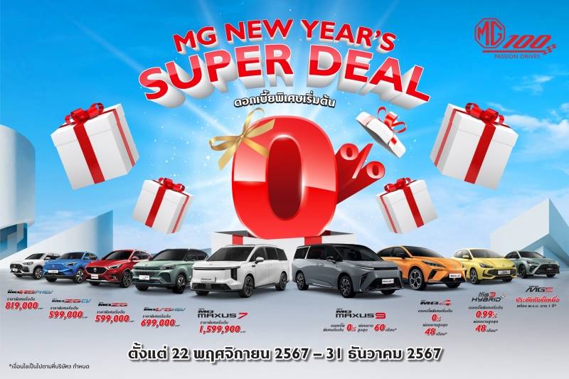 Promotion MG ส่งแคมเปญพิเศษ NEW YEAR’S SUPER DEAL ด้วยดอกเบี้ยต่ำสุด 0% นานสูงสุดถึง 5 ปี ฟรี ประกันภัยชั้น 1 พร้อม พ.ร.บ. นานสูงสุด 3 ปี และมั่นใจกับการใช้รถระยะยาวด้วยการรับประกันแบตเตอรี่ และระบบขับเคลื่อนตลอดอายุการใช้งานไม่จำกัดผู้ขับขี่ ตั้งแต่วันนี้ ถึงวันที่ 31 ธันวาคม