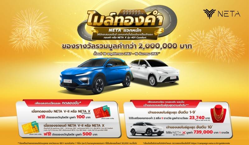 นอกจากนี้ยังมีแคมเปญส่งท้ายปี รับเทศกาลแห่งความสุข “โกลเด้น ไมล์ (Golden Miles) NETA แจกหนัก ให้นักสะสมเลขไมล์” ชวนบอกลาค่าน้ำมัน ยิ่งเลขไมล์เยอะยิ่งเพิ่มโอกาส รับรางวัลใหญ่ ถึง 10 รางวัล สำหรับเจ้าของรถที่เลขไมล์สะสมสูงสุด 10 อันดับแรก ลำดับที่ 1 ถึง 9 ได้รับสร้อยคอทองคำ 2 สลึง ลำดับที่ 10 ได้ NETA X รุ่น 401 Comfort และยังมีรางวัลพิเศษอื่น ๆ อีกมายมายเมื่อทดลองขับ หรือจองรถ รวมมูลค่ากว่า 2,000,000 บาท สามารถร่วมแคมเปญ “โกลเด้น ไมล์” ได้ที่ https://campaign.neta.co.th/goldenmile/register ตั้งแต่ 18 พฤศจิกายน 2567 ถึง 16 ธันวาคม 2567 ประกาศผู้โชคดี 25 ธันวาคม 2567